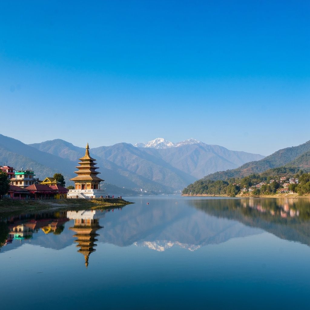 Descubre la serenidad del lago Phewa y la belleza de la Pagoda de la Paz Mundial.